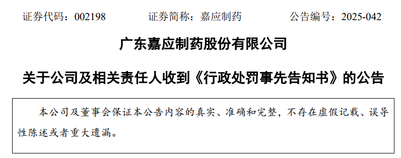 8月3日晚,嘉应制药(002198)公告称,2025年8月1日,公司及相关责任人李能(现任董事长)、游永平(现任董事、总经理)、史俊平(时任财务总监)收到中国证监会广东监管局下发的《行政处罚事先告知书》(广东证监处罚字【2025]10号)。